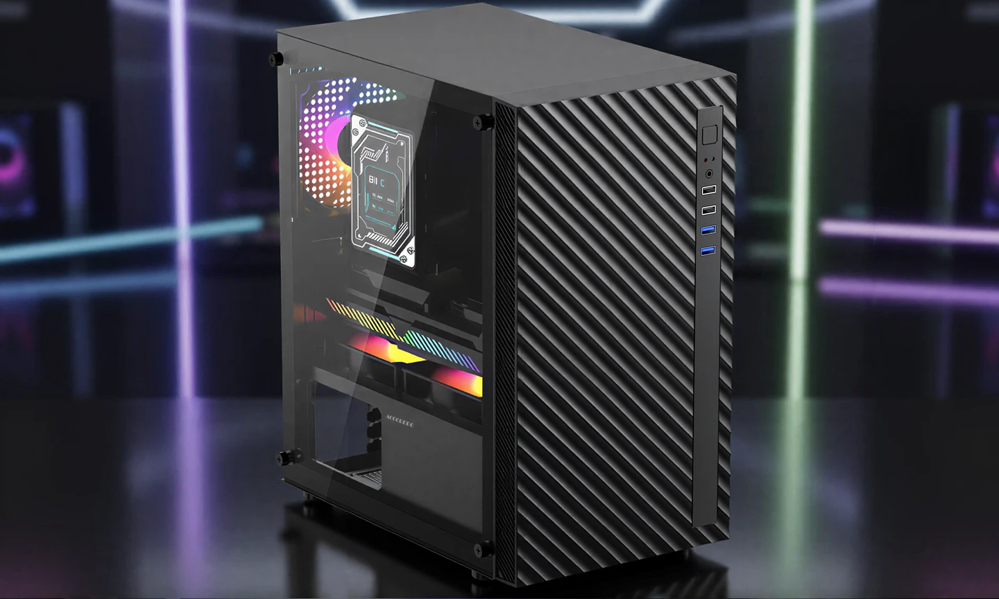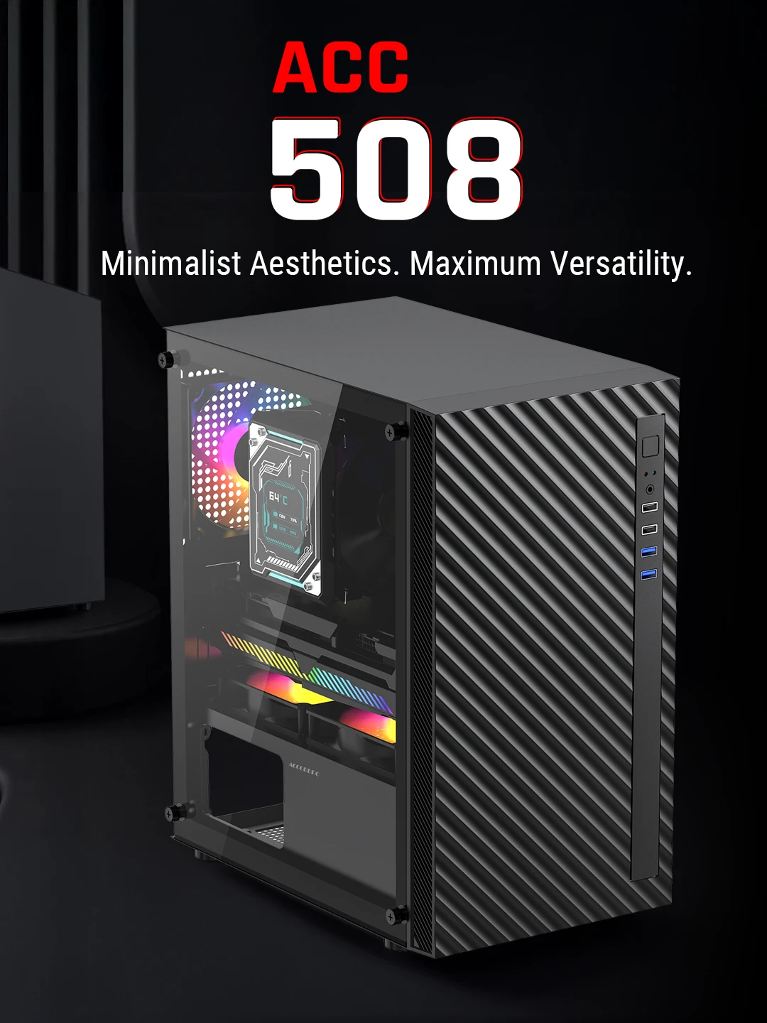 Make a statement with a front panel that stands out. The ACC-508 features a unique diagonal-slotted ABS design that not only provides a modern aesthetic but also facilitates improved airflow to your core components.