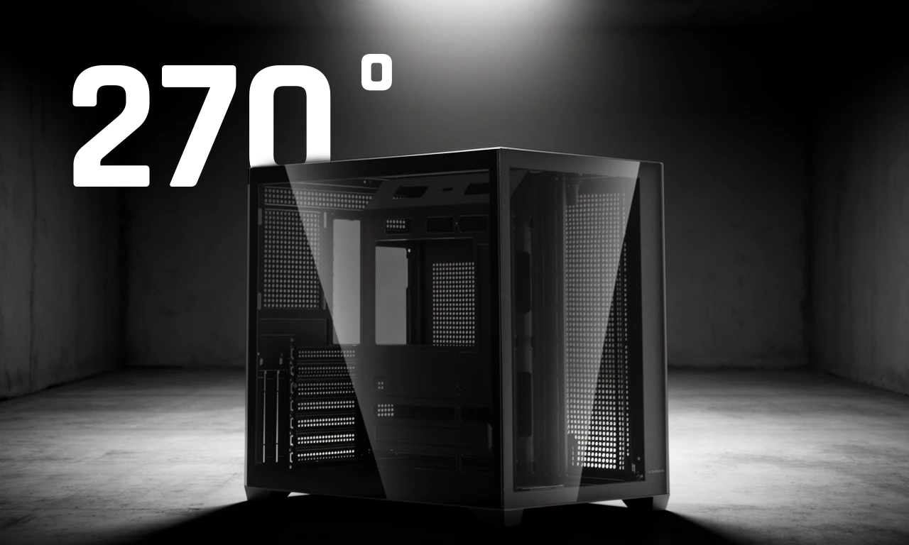The pillar-less front and side tempered glass panels create a seamless ``aquarium-style`` showcase. This continuous 270-degree view turns your high-end components and RGB lighting into the centerpiece of your desk.