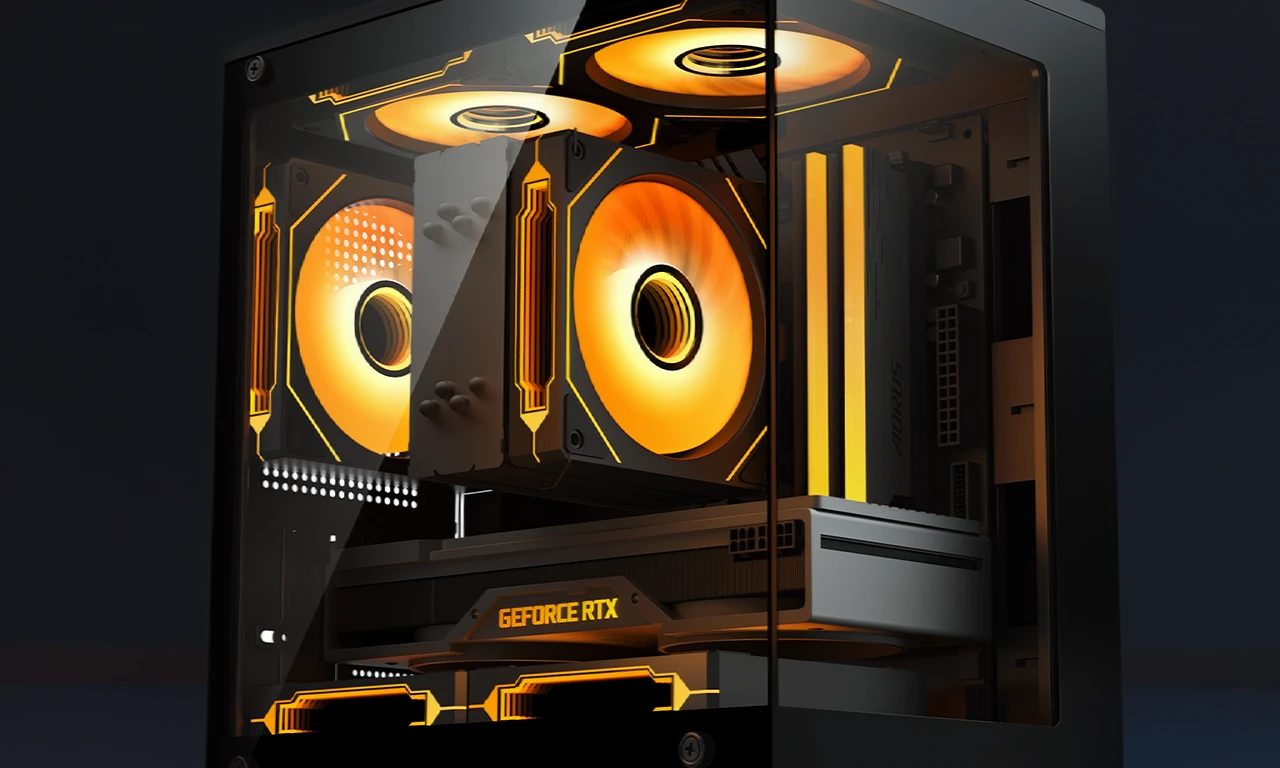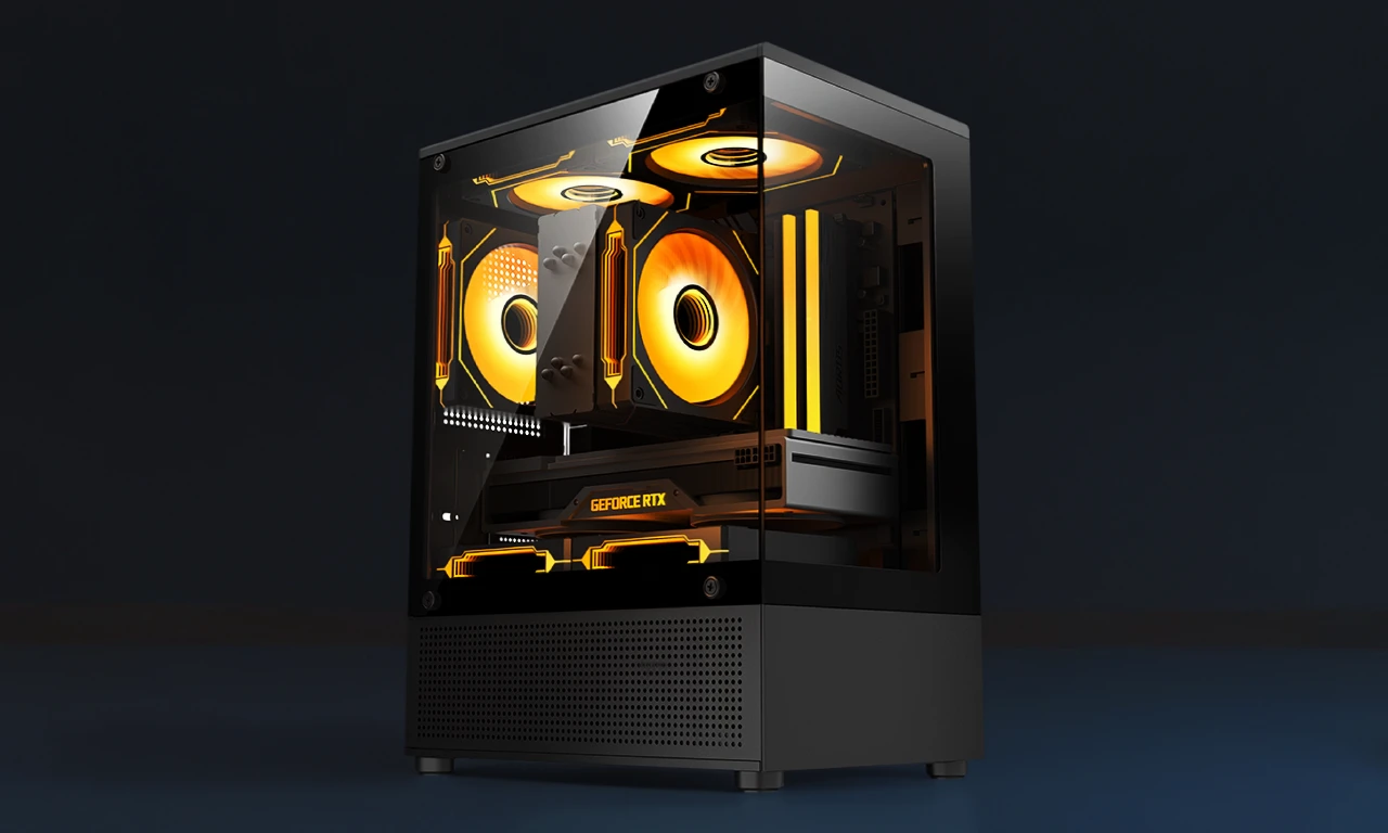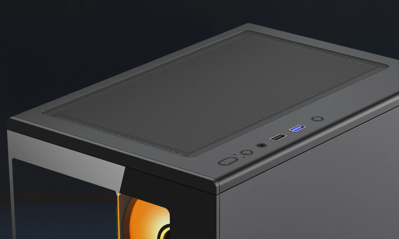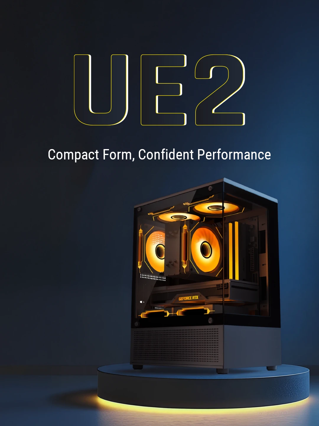 UE2 обеспечивает эффективный поток воздуха и элегантный обзор через панель из закалённого стекла, сочетая производительность и внешний вид в одной сбалансированной сборке.